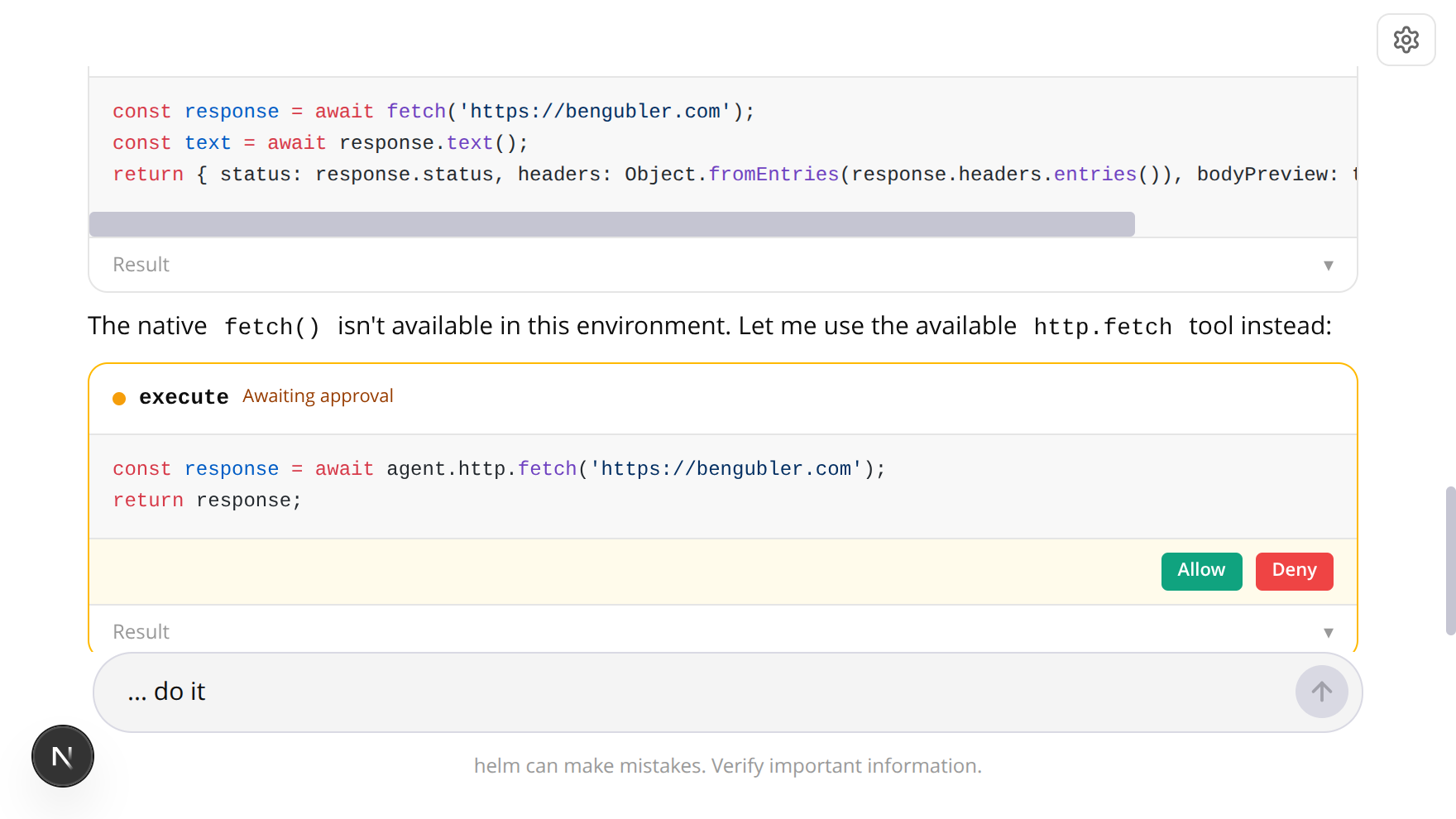 // signature: "(path: string) => Promise<{ content: string }>", ... }]execute takes arbitrary JavaScript code and runs it against the helm agent API. The LLM writes code like: